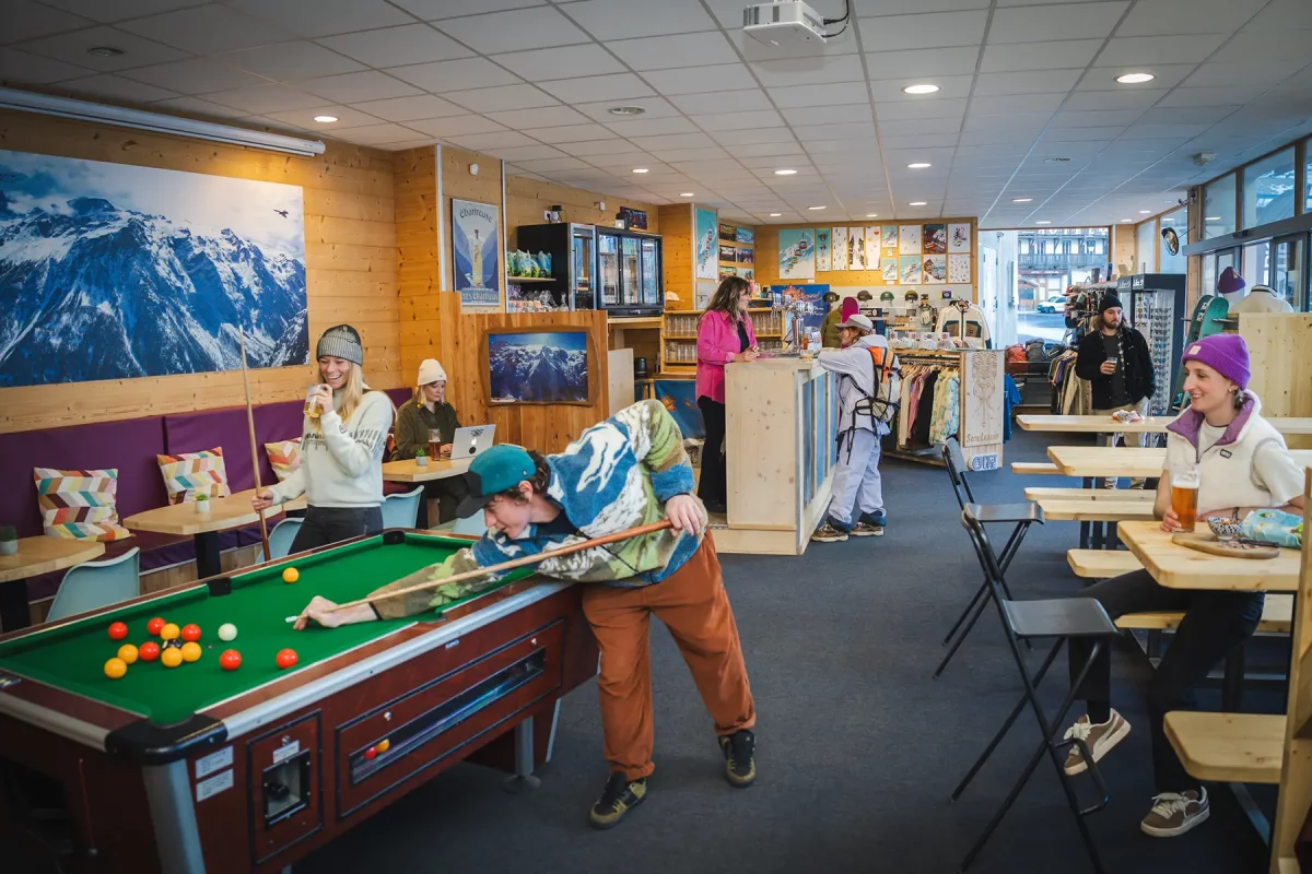 welcomes you before and after skiing with a great selection of drinks, tapas, and more in a friendly atmosphere. The giant screen shows the FWT, rugby, snow sports films, and more.
