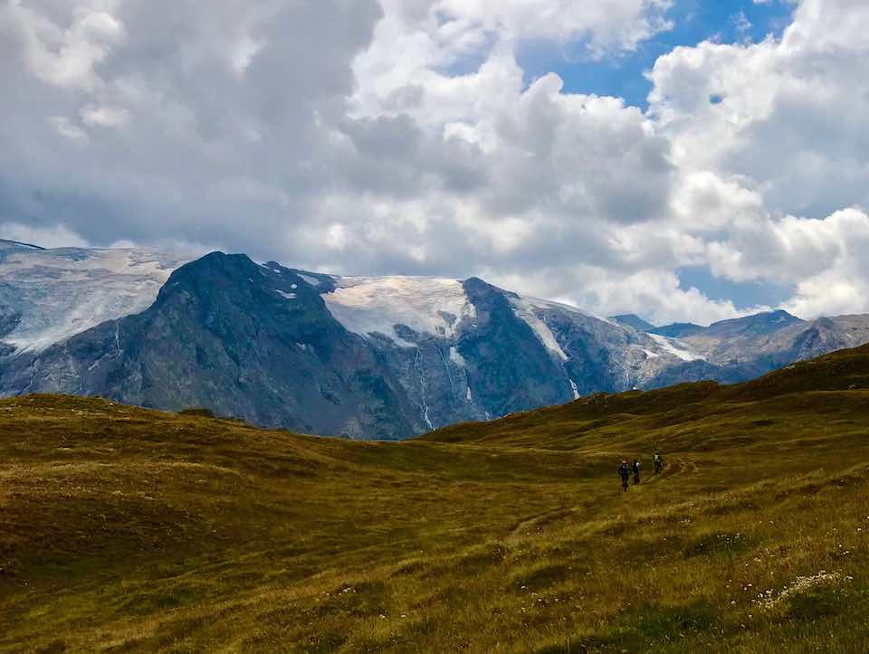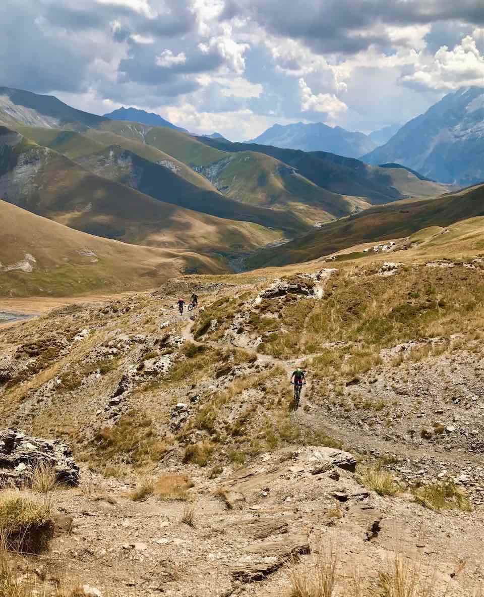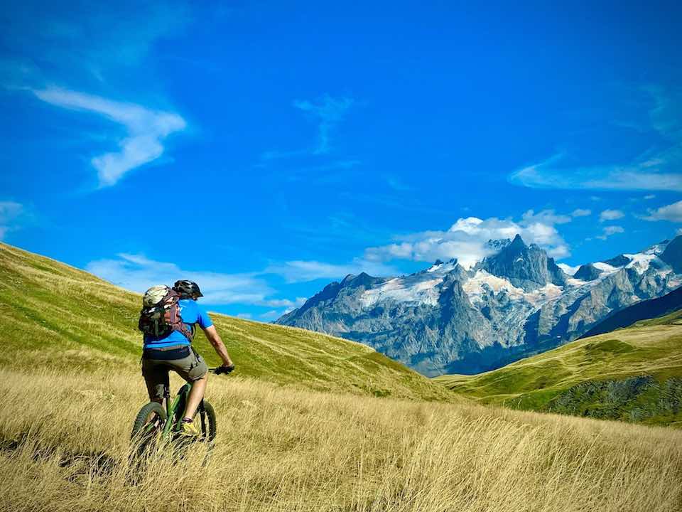 Le départ est identique à celui du Vallon de la Buffe. Le début du circuit est toujours aussi magique avec ces hameaux d’estive, les bergeries, les gros papillons apollons jaunes qui virevoltent, les cailles de blés qui évoluent près la rivière. Une fois arrivé à proximité des cabanes au fond du vallon de la Buffe après le refuge du Pic du Mas de La Grave, on continue sur le sentier. Le chemin se fait escarpé, technique. Il faut s’aider du moteur pour avancer et pousser le mountain bike sur quelques passages pour arriver jusqu’au Col des trente combes. 20 bonnes minutes à apprécier le mode « Boost » et les 720 watts du vttae. Arrivé à l’épaule à 2385m, on descend paisiblement sur les crêtes, on longe le ruisseau de Rachas en direction du sommet du Gros Têt. Avant de l’atteindre, on oblique sur la gauche vers le col Saint Georges. La piste est bonne et on peut lâcher les freins en s’orientant vers le parking. On passe par les zones humides très dégagées du Rif-Tort. Nous sommes dans les Alpes mais on se croirait ailleurs, en Mongolie, avec de vastes prairies vertes désertiques. On remonte ensuite vers le col du Souchet, à 2365m et on s’oriente sur la droite en quittant le GR 54 par une combe herbeuse vers les lacs Lérié et noir. Les étangs sont bien indiqués. « L’endroit est idéal pour pique-niquer avec une vue fantastique sur les glaciers de la Girose et les trésors cachés de la face nord de la Meije qui se reflètent sur l’eau. Plusieurs langues de glace s’étendent vers la vallée, on y voit de grandes cascades et le haut des couloirs qui font le bonheur des skieurs hors-pistes en hiver. Après s’être restauré et avoir dévoré des yeux les merveilles de la plus grande calotte glacière de France, on descend vers le rif de Gayant. La descente est technique avec des sentiers parfois ravinés. Il convient de rester lucide, concentré car certains passages sont parfois très creusés et les pédales peuvent toucher. On rejoint ainsi le Clôt Raffin dès qu’on voit le Chazelet en passant par le sentier en zigzags à gauche après avoir croisé un téléski sans prendre le GR 54 qui présente parfois des endroits abrupts presque vertigineux puis le Chazelet et descente à La Grave par le chemin du facteur.